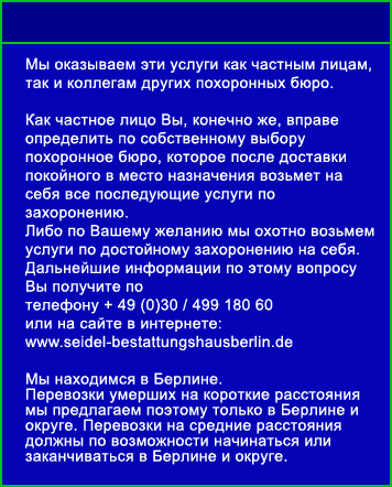 Als Privatperson können Sie natürlich einen Bestatter Ihres Vertrauens wählen, der nach der Über- oder Rückführung an den Bestimmungsort alles weiter für das Begräbnis für Sie übernimmt. Gerne führen wir dieses auch pietätvoll für Sie durch. Weitere Informationen erhalten Sie dazu unter der Telefonnummer 030 / 499 180 60 oder besuchen Sie unsere Webseite: